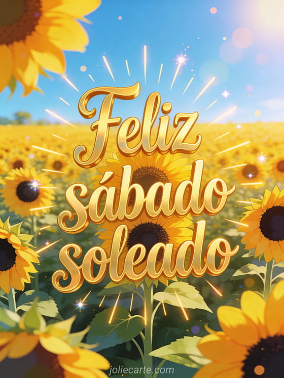 Comparte un saludo inspirador de feliz sábado soleado con un vasto campo de girasoles que se extiende hasta el horizonte bajo un cielo azul brillante. Descubre también feliz sábado feliz fin de semana imágenes, feliz sábado y buen fin de semana o una feliz sábado imagen.
