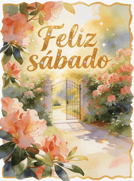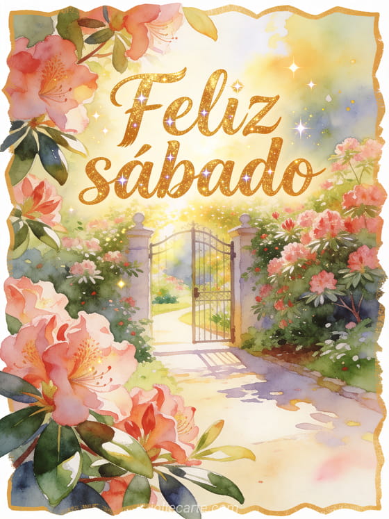Comparte un feliz sábado alegre con letras doradas, un portón de jardín iluminado por el sol y rododendros abundantes. Esta tarjeta gratis suma destellos, hojas brillantes y un sendero suave para empezar el fin de semana con color. Descubre también un feliz sábado muchos besos gif, una imagen gratis buenos días sábado o un feliz sábado y buen fin de semana gif animado.
