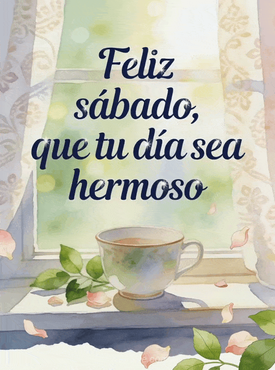 Comparte un texto de feliz sábado con caligrafía azul marino elegante, una taza de porcelana en el alféizar, hojas verdes, pétalos sueltos y luz de mañana entre cortinas estampadas. También puedes enviar imagen feliz sábado amigos, buenos días feliz sábado imagen o feliz sábado gif animado.