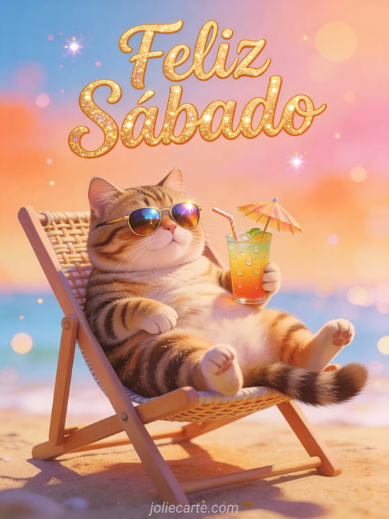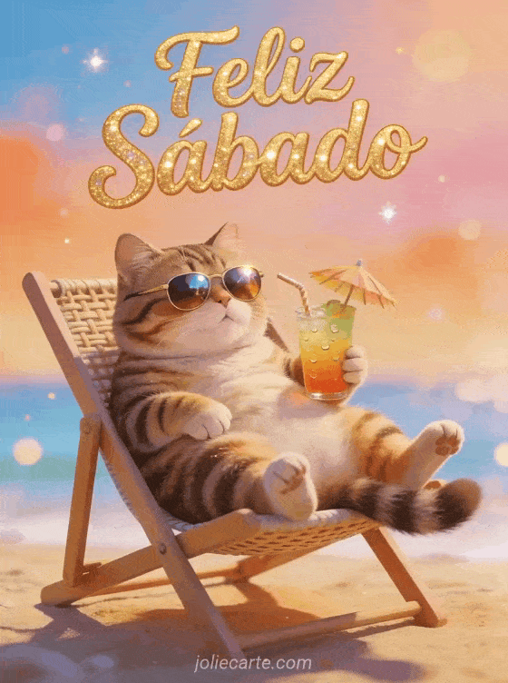 Envía un divertido saludo de feliz sábado con un gordito gato con gafas de sol descansando en una silla de playa con un cóctel tropical. Una forma divertida de empezar el fin de semana. Descubre también una tarjeta sábado con gatito o una tarjeta sábado con gato.
