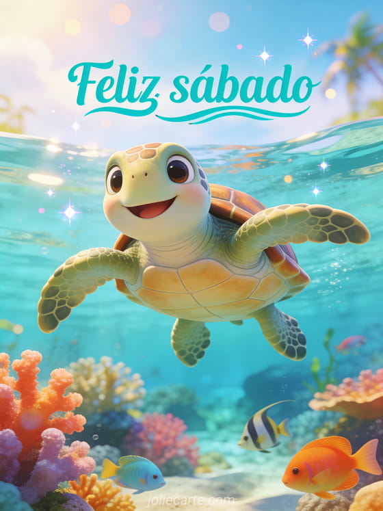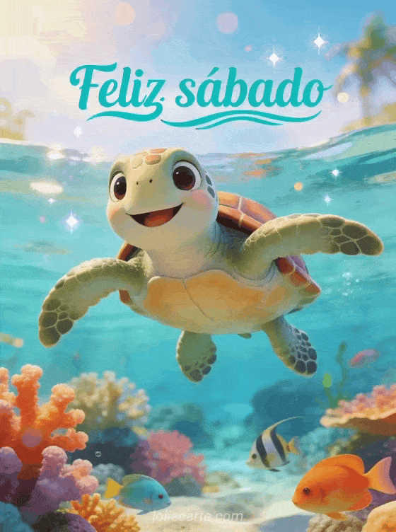 Comparte un saludo soleado de feliz sábado con una tortuga marina tierna nadando en agua tropical cristalina sobre un arrecife de coral colorido y peces. Descubre también una feliz sábado imagen, feliz sábado imágenes o una feliz sábado otoñal imagen.