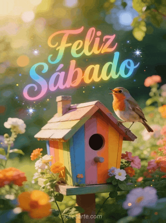 Envía un alegre saludo de feliz sábado con un colorido petirrojo cantando en una casita de pájaros en un jardín luminoso. Una forma alegre de desear un maravilloso sábado. Descubre también una tarjeta de sábado con humor o una tarjeta dulce sábado con besos.