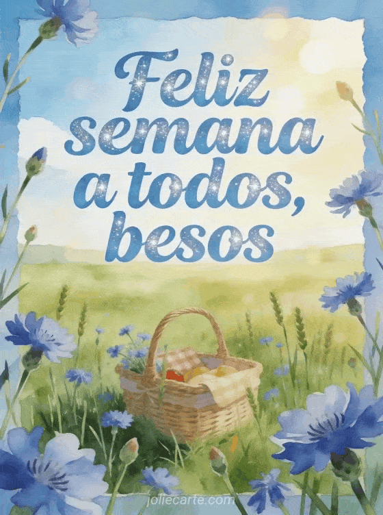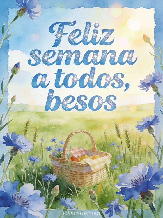 Envía un saludo cálido de feliz semana a todos con una cesta de picnic entre acianos, una pradera verde y un cielo abierto y brillante. Descubran también una feliz semana besos gifs animados, una linda semana besos o una foto feliz semana.
