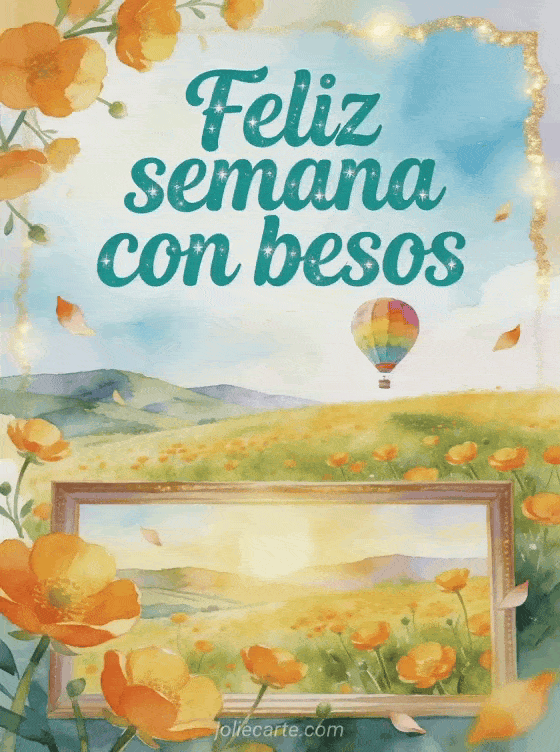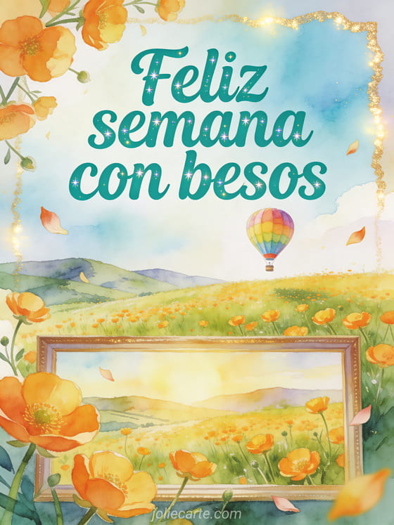 Envía una tarjeta alegre de feliz semana con una pradera de ranúnculos y un globo aerostático colorido flotando sobre colinas lejanas. Descubran también una feliz semana gif besos, una buena semana muchos besos o besos para toda la semana.