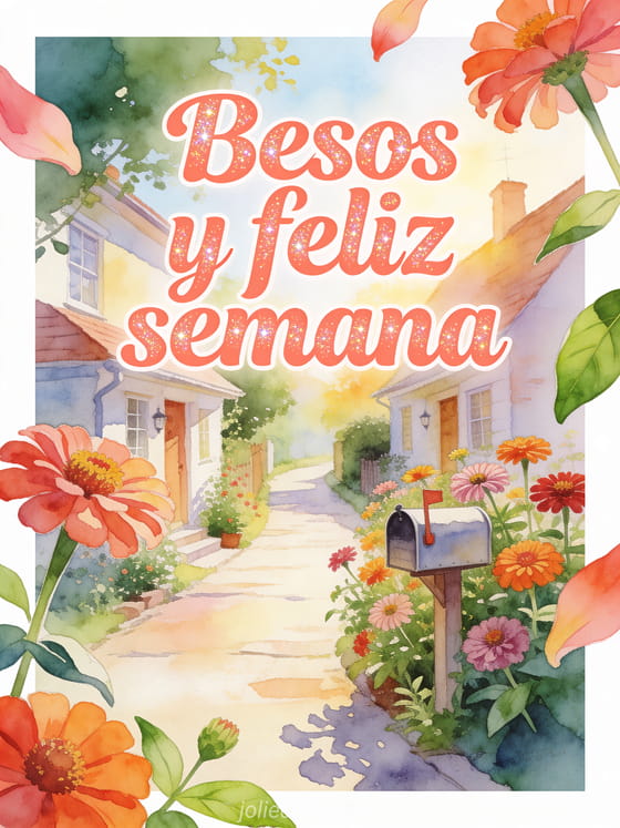 Envía una tarjeta gif de feliz semana con un sendero, un pequeño buzón y zinnias brillantes en cálida luz matinal. Descubran también una buena semana muchos besos, besos para toda la semana o una feliz semana tarjeta besos.