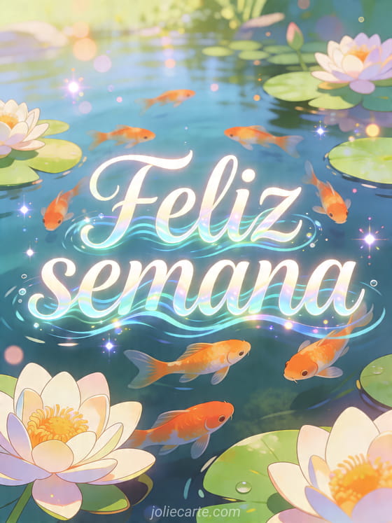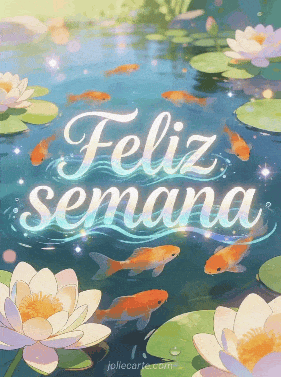 Comparte esta apacible tarjeta de feliz semana con peces dorados, nenúfares y un estanque tranquilo. También pueden descubrir buena semana gifs humor, feliz semana besos gif y buena semana imagen gratis.