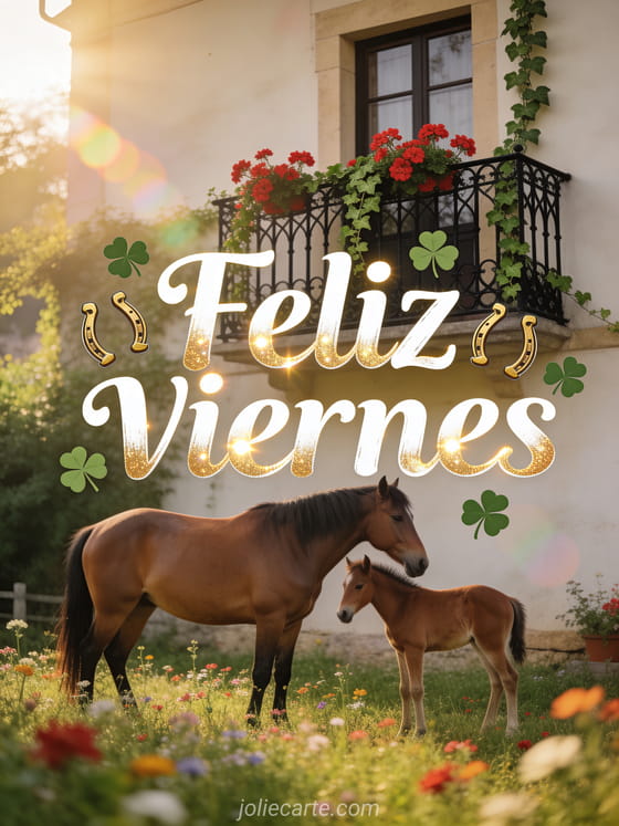 Compartan una tarjeta campestre luminosa de feliz viernes con letras color crema, reflejos dorados, herraduras, tréboles, un balcón negro de hierro forjado cubierto de geranios rojos y hiedra, más una yegua y su potrillo en un prado florido. Vean también feliz viernes divertido humor, feliz viernes flores imágenes o feliz viernes paisaje.