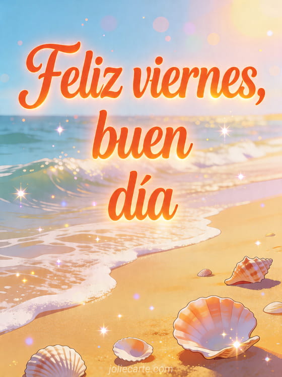 Comparte un saludo relajante de feliz viernes con esta tarjeta de playa llena de luz suave de la mañana. Descubre también buenos días feliz viernes, desayuno feliz viernes café o buenos días feliz viernes buen día.