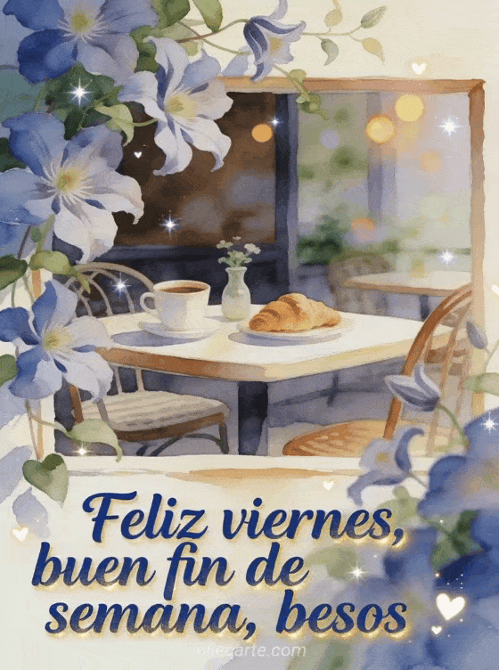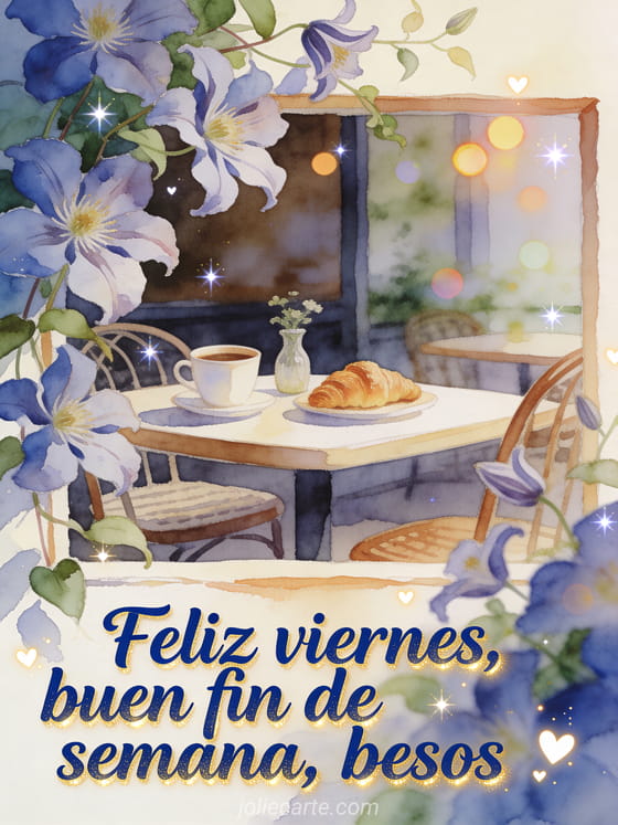 Compartan un saludo cálido de viernes y fin de semana con flores de clemátide, una mesa de café al aire libre, una taza de café, croissant y un pequeño jarrón en acuarela. Descubran también imágenes gratis feliz fin de semana besos, feliz fin de semana besos gifs o que tengas un buen fin de semana besos.
