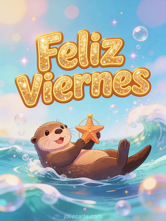 Comparte un saludo divertido de feliz viernes con letras de caricatura alocadas, borde dorado brillante y una nutria graciosa flotando de espaldas mientras sostiene una estrella de mar como premio. Descubre también gifs animados de feliz viernes con besos, una frase de buenos días viernes o imágenes gratis de feliz viernes.