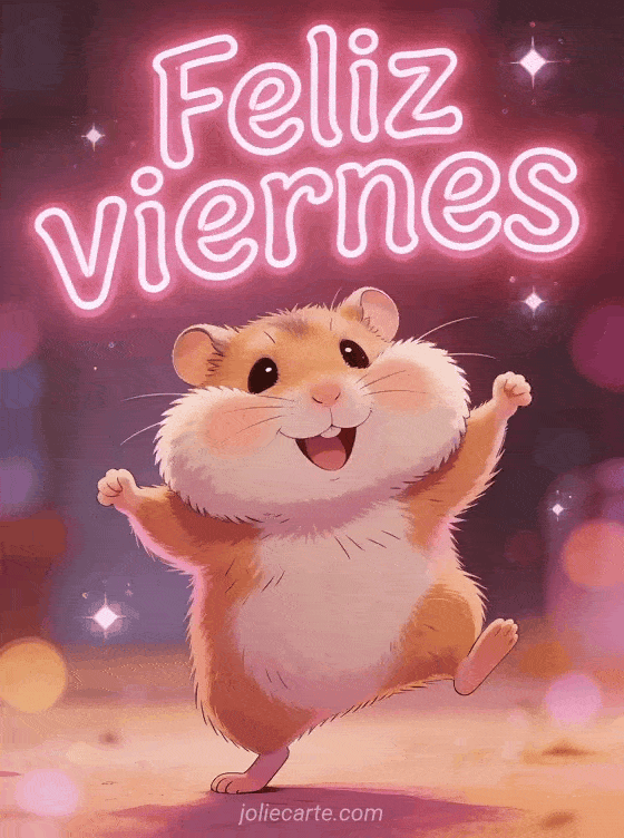 Comparte un saludo divertido de feliz viernes con letras tambaleantes en neón rosa y un hámster gracioso con mejillas llenas haciendo un baile feliz. Descubre también imágenes de flores para feliz viernes, una tarjeta de feliz viernes paisaje o una tarjeta de feliz viernes.