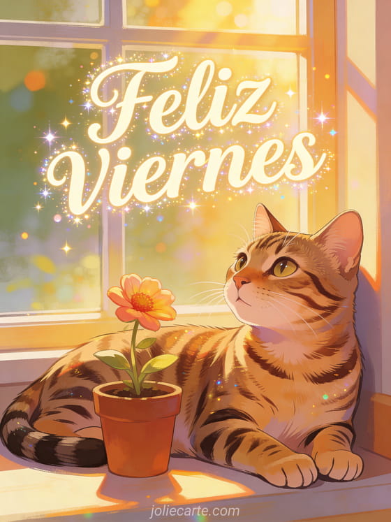 Comparte una imagen de feliz viernes con letras cremosas, brillos alegres y un gato bengal descansando junto a una ventana soleada y una maceta. También pueden enviar ánimo es viernes, una feliz viernes y feliz fin de semana imagen o un buenos días viernes humor gif.