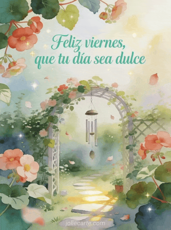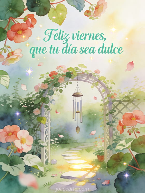 Envía un deseo tierno de feliz viernes con begonias, un arco de jardín, un carillón y piedras iluminadas por el sol. Descubre también feliz viernes soleado imagen, feliz viernes imagen muy bonita o feliz viernes gif brillante.