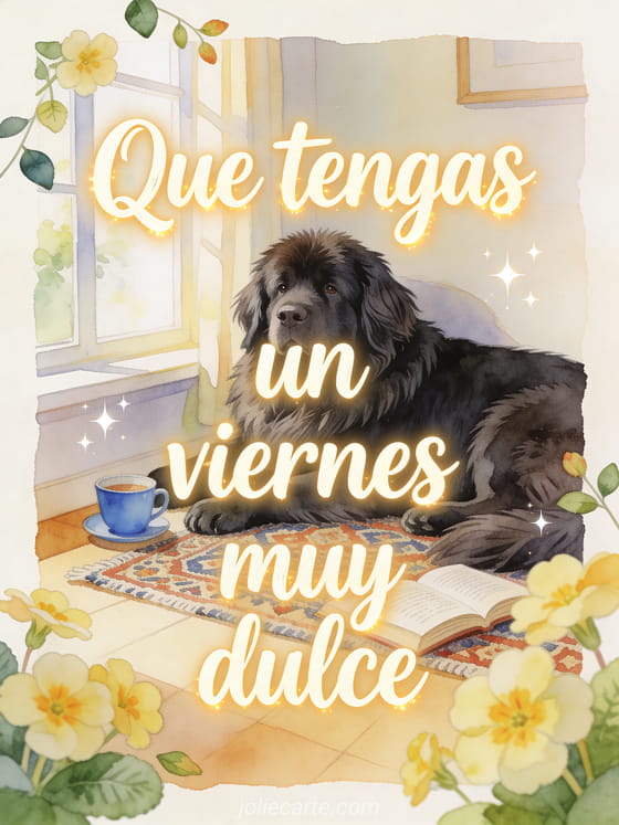 Comparte un mensaje dulce de viernes con un perro de Terranova descansando en un rincón de lectura luminoso, prímulas, una alfombra estampada y una taza azul. También puedes enviar una imagen brillante feliz viernes, una feliz viernes cita positiva imagen o buenos días viernes imágenes.