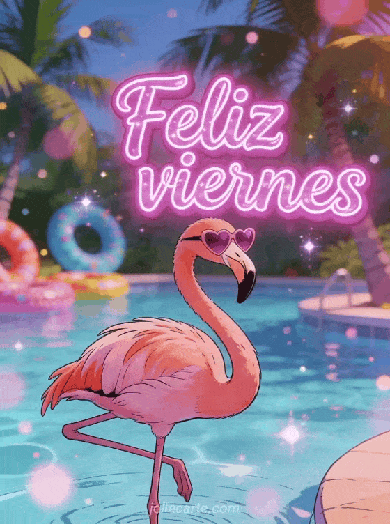 Comparte un saludo alegre de feliz viernes con letras cómicas magenta, un flamenco gracioso en una pata y gafas en forma de corazón con ambiente de fiesta tropical en la piscina. Descubre también una tarjeta de muy feliz viernes, una tarjeta de buenos días viernes con besos o una imagen de gato para feliz viernes.