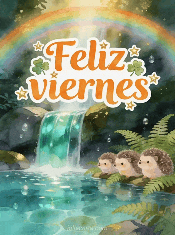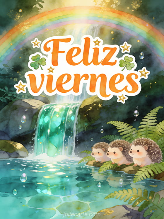 Compartan una tarjeta viva de feliz viernes con letras naranja acuarela, tréboles de la suerte, estrellas doradas, una cascada esmeralda, un arcoíris brillante y una familia de erizos tiernos entre helechos junto al agua cristalina. Vean también mensaje para desear feliz viernes, feliz viernes muchos besos o este buenos días viernes humor.