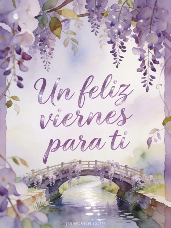 Comparte un feliz viernes sereno con letras lavanda elegantes y brillo perlado. Esta tarjeta gratis muestra un puente arqueado sobre un río estrecho cubierto de glicina colgante, con flores en cascada y reflejos luminosos. Descubre también feliz viernes y feliz fin de semana imágenes, un buenos días viernes gif o un texto de feliz viernes.
