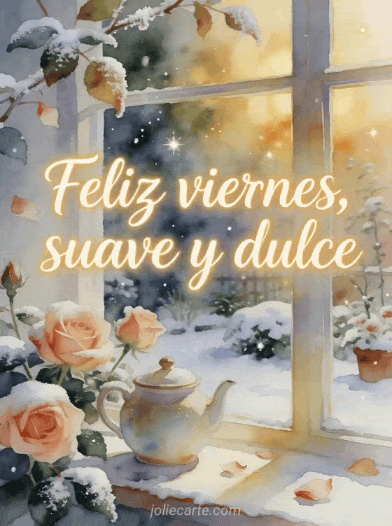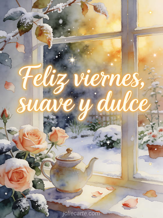 Desea un feliz viernes suave con rosas cubiertas de nieve, una tetera de cerámica y luz dorada de ventana en un jardín de invierno acogedor. También pueden enviar buenos días es viernes imagen, buenos días y feliz viernes imágenes o feliz viernes mi querida imágenes.