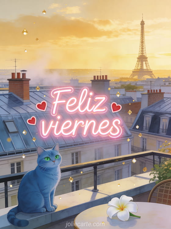 Envíen una tarjeta romántica de feliz viernes con letras neón rosa suave, corazones rojos, destellos dorados y una terraza parisina en una azotea con vista a tejados de zinc y chimeneas, un gato azul ruso de ojos verdes, una flor de tiaré blanca y la Torre Eiffel con luz de golden hour. Descubran también buen día de viernes besos, buenos días viernes imagen o buenos días de viernes humor.