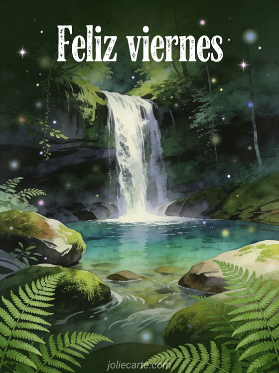 Comparte un saludo tranquilo de feliz viernes con letras rústicas verde bosque, una cascada majestuosa cayendo en una piscina cristalina, helechos frondosos y rocas con musgo. Descubre también una tarjeta de feliz viernes, una tarjeta de buenos días es viernes con humor o una tarjeta de buen día viernes.