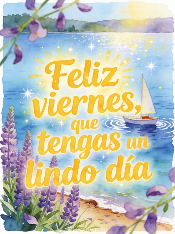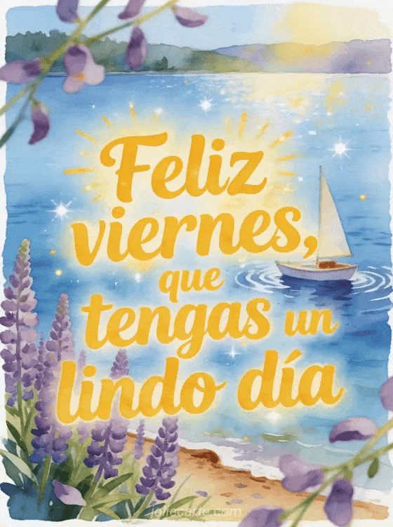 Envíen feliz viernes sol gif con letras amarillas, una escena luminosa junto al lago, un velero pequeño, agua azul ondulada y lupinos morados. Descubran también una imagen de feliz viernes con flores, un feliz viernes invernal gif o una buenos días es viernes imagen.