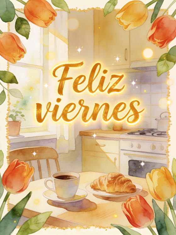 Envía un saludo alegre de feliz viernes con tulipanes brillantes, hojas frescas, una taza de café y croissants mantequillosos sobre una mesa acogedora en una cocina soleada. Descubre también texto para desear un feliz viernes, una feliz viernes mariposa imagen o feliz viernes imágenes animadas.