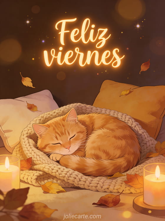 Comparte un saludo cálido de feliz viernes y buen fin de semana con un gato naranja esponjoso acurrucado sobre una manta tejida, hojas de otoño, luz de velas y cojines. Descubre también una imagen de feliz viernes besos, una tarjeta feliz viernes o un feliz viernes divertido humor gif.