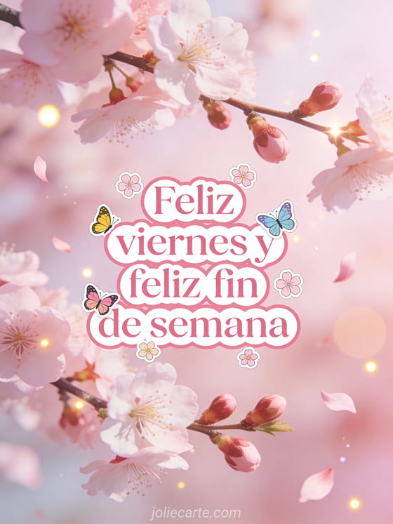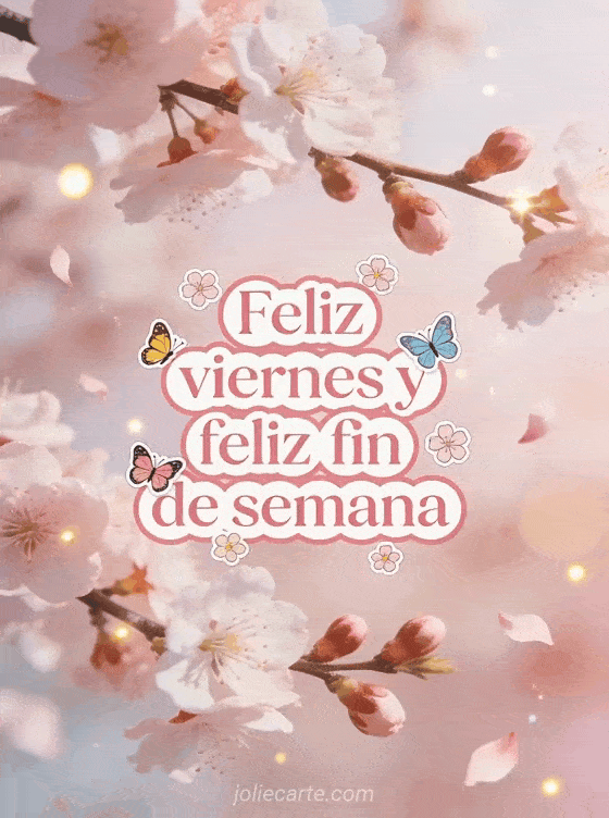 Compartan un saludo alegre de viernes y fin de semana con ramas de cerezo en flor, mariposas coloridas, pétalos rosados suaves y luz brillante de primavera. También pueden enviar buenos días viernes humor gif o feliz viernes paisaje gif.