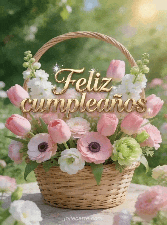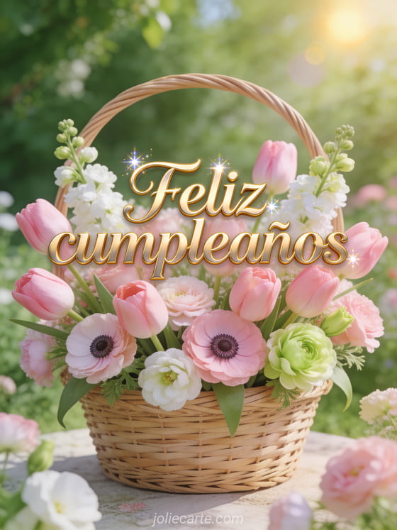 Compartan una tarjeta elegante de cumpleaños con tulipanes rosados, anémonas y lisiantos en cesta de mimbre sobre un jardín luminoso. También pueden descubrir imagen feliz cumpleaños con flores, feliz cumpleaños musical y feliz cumpleaños con ternura.