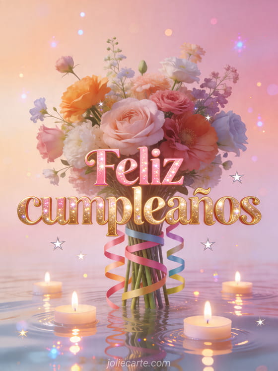 Comparte un alegre deseo de cumpleaños con esta delicada tarjeta floral de flores coloridas, velas flotantes y estrellas brillantes sobre un fondo pastel. Descubre también carta para desear feliz cumpleaños, ramo de flores feliz cumpleaños y feliz cumpleaños flores naturaleza.