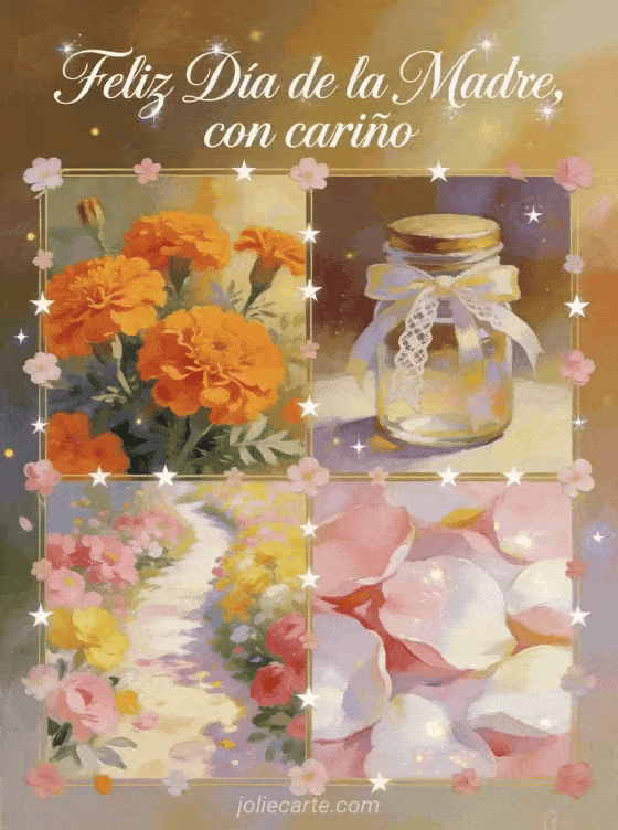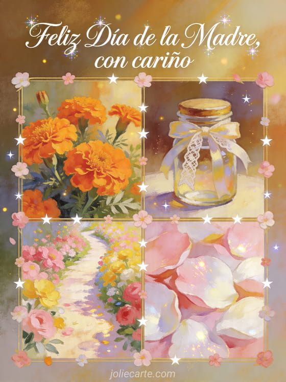 Comparte una tarjeta soleada del Día de la Madre con caligrafía pintada, flores de caléndula, un frasco de recuerdo con cinta, un camino floral y pétalos brillantes. Descubre también una Feliz Día de las Madres suegra, un texto para el Día de las Madres o Feliz Día de las Madres imágenes.