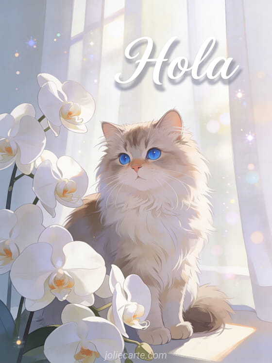 Envía este elegante hola con un gato persa esponjoso sentado entre orquídeas blancas en suave luz matinal. Descubre también una tarjeta hola cómo estás o una tarjeta de buenos días.