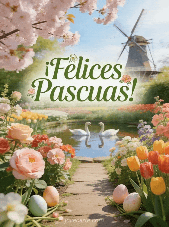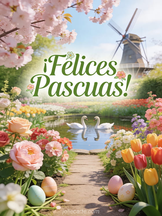 Envía esta hermosa tarjeta con imágenes de flores de Pascua del jardín de Keukenhof. Descubre también una cita Felices Pascuas o lindas tarjetas de Pascua.
