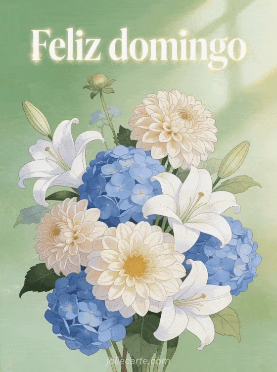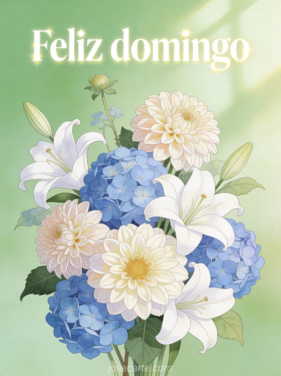 Compartan un saludo elegante de domingo con un arreglo floral espectacular de dalias, hortensias azules y lirios blancos sobre un fondo verde tierno. También pueden enviar feliz domingo mensaje o buenos días feliz domingo.
