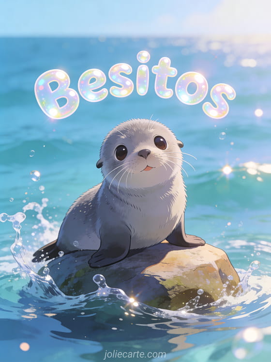 Envía alegres besitos con esta encantadora tarjeta con una adorable foca gris posada en una roca junto al mar. Descubre también tarjeta muchos besos o tiernos besitos animados.
