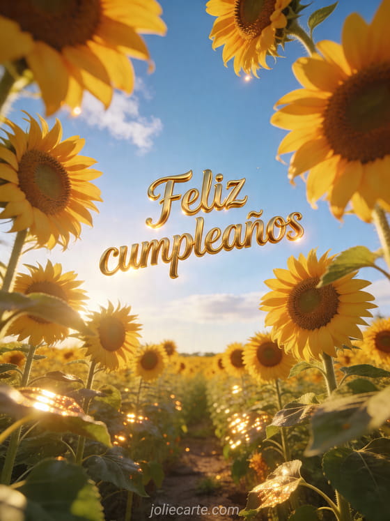 Comparte un feliz cumpleaños soleado con esta tarjeta fotorrealista de un campo brillante de girasoles bajo un cielo azul de verano. También puedes descubrir cumpleaños mujer humorístico, tarjeta feliz cumpleaños mujer o flor feliz cumpleaños mujer.