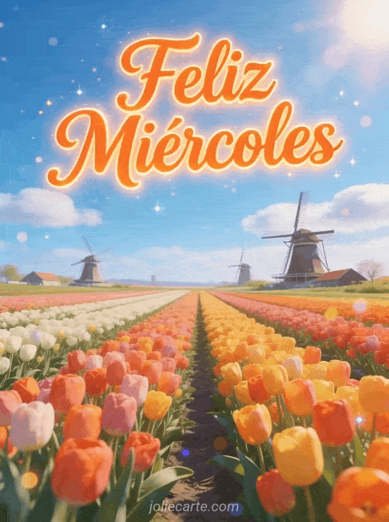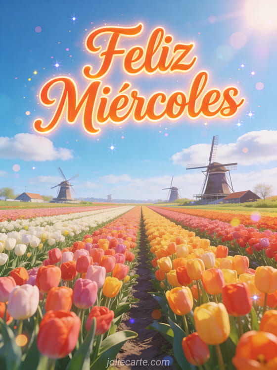 Comparte un alegre miércoles soleado con esta vibrante tarjeta del campo de tulipanes holandés. Descubre también una imagen feliz miércoles bajo la lluvia o una tarjeta feliz miércoles caballos.