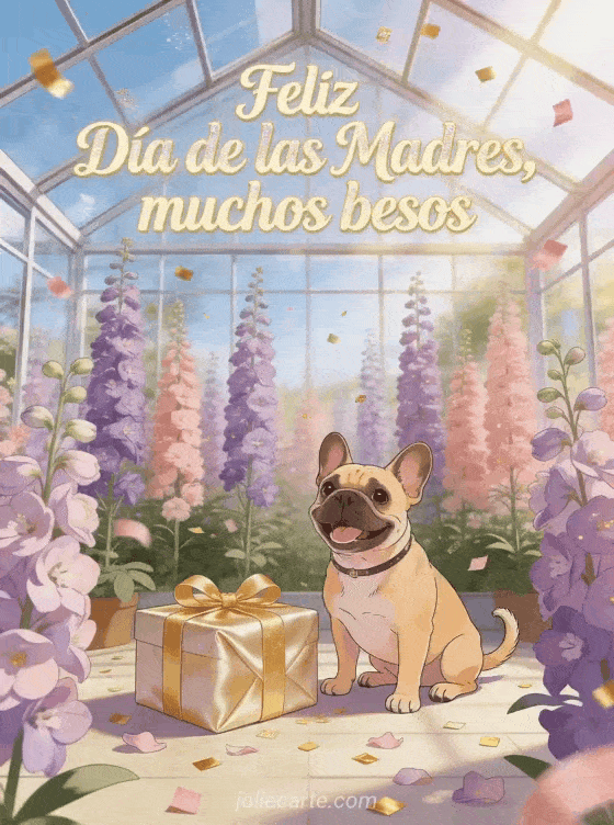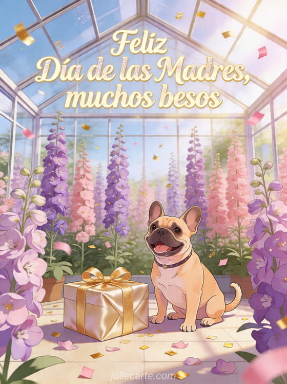 Comparte una foto para el Día de las Madres con letras crema, brillo sutil y un invernadero luminoso lleno de espuelas de caballero altas. Un bulldog francés se sienta junto a una caja de regalo satinada y confeti en esta tarjeta alegre. Descubre también poemas del Día de las Madres, imágenes feliz Día de las Madres o poema del Día de la Madre.