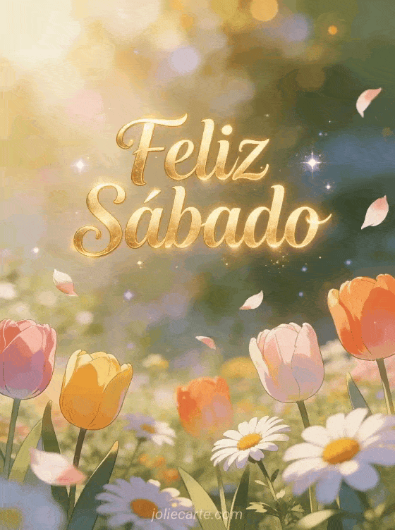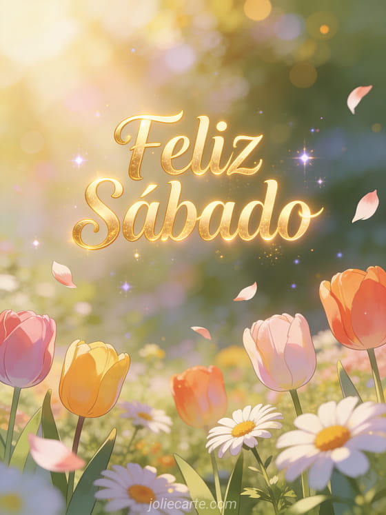 Comparte un alegre deseo de feliz sábado con esta hermosa tarjeta con coloridos tulipanes y margaritas en un jardín de primavera. Descubre también un feliz sábado o feliz sábado humor para más inspiración de sábado.