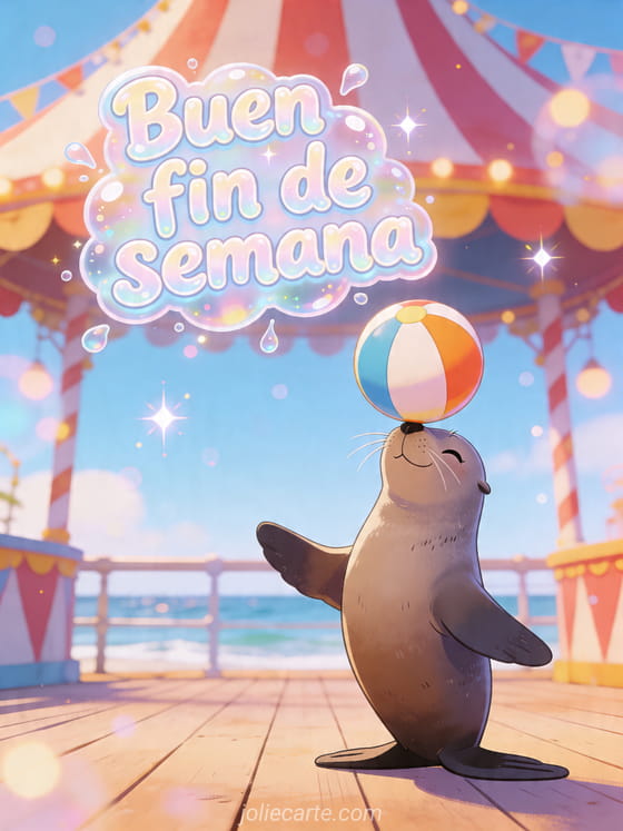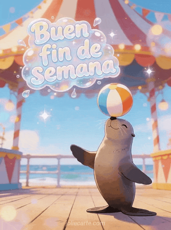 Comparte esta divertida tarjeta de buen fin de semana con una foca guiñando el ojo, un globo y un ambiente de espectáculo junto al mar. También pueden descubrir bellas imágenes buen fin de semana, buen fin de semana humor gif animado y buen fin de semana.