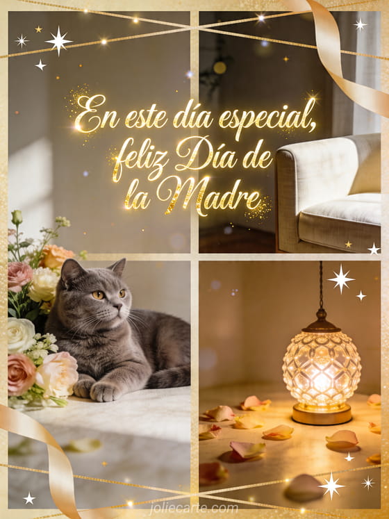 Envía una tarjeta elegante del Día de la Madre con un collage realista de cuatro paneles, un gato cartujo, flores frescas, un sillón de lino y una lámpara luminosa. Descubre también un Día de las Madres texto, una tarjeta con corazón para el Día de la Madre o un poema de amor para el Día de las Madres.