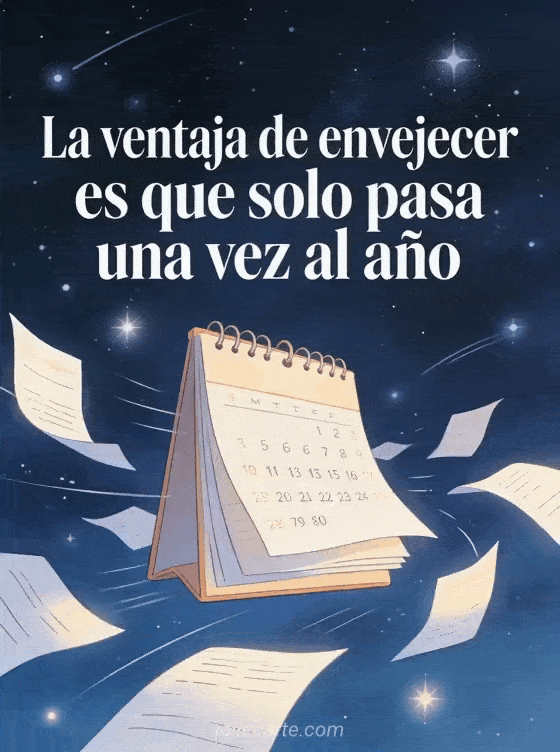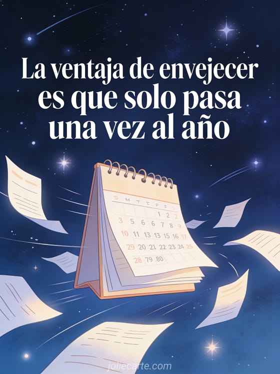 Envía esta tarjeta con frase de cumpleaños y humor bajo un cielo nocturno estrellado con páginas de calendario que vuelan. Descubre también un texto gracioso de cumpleaños o una mujer graciosa feliz cumpleaños humor.