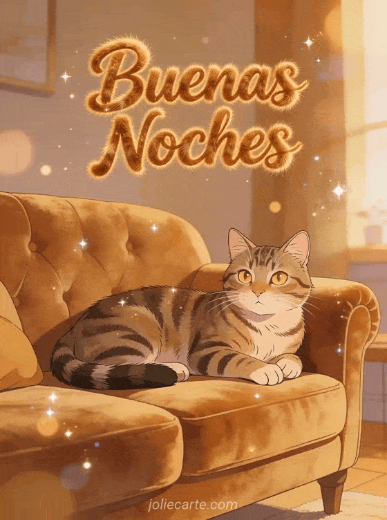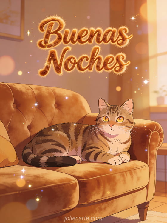 Envía un acogedor gato buenas noches con esta elegante tarjeta gratis. Un elegante gato atigrado con ojos brillantes tumbado en un sofá de terciopelo con una atmósfera cálida y acogedora en tonos ámbar, perfecta para un saludo de buenas noches acogedor. Descubre también una tarjeta buenas noches junto a la chimenea o una tarjeta buenas noches gracioso gracias.
