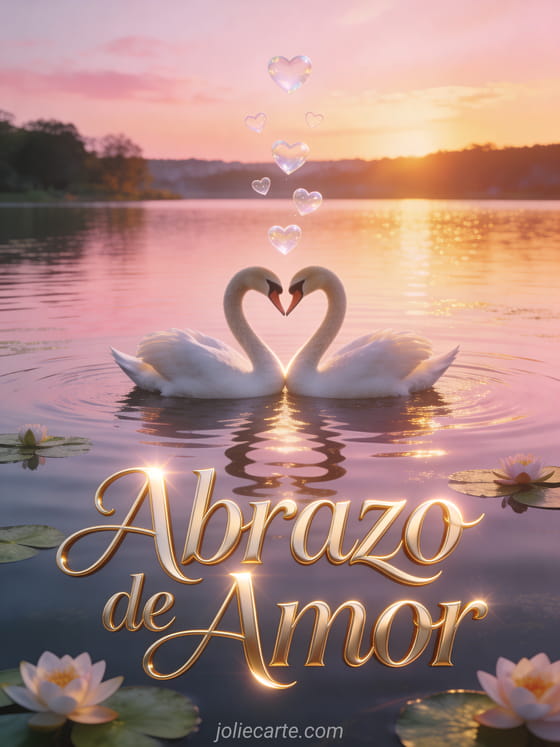 Envía esta majestuosa tarjeta de abrazo de amor con dos cisnes formando un corazón con sus cuellos sobre un lago tranquilo al atardecer con reflejos rosas y dorados en el agua y corazones translúcidos flotando sobre nenúfares en flor. Una forma romántica de expresar tu amor. Descubre también una tarjeta de gran abrazo de amor o una tarjeta de abrazo reconfortante.
