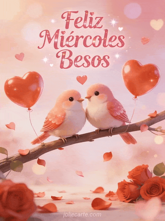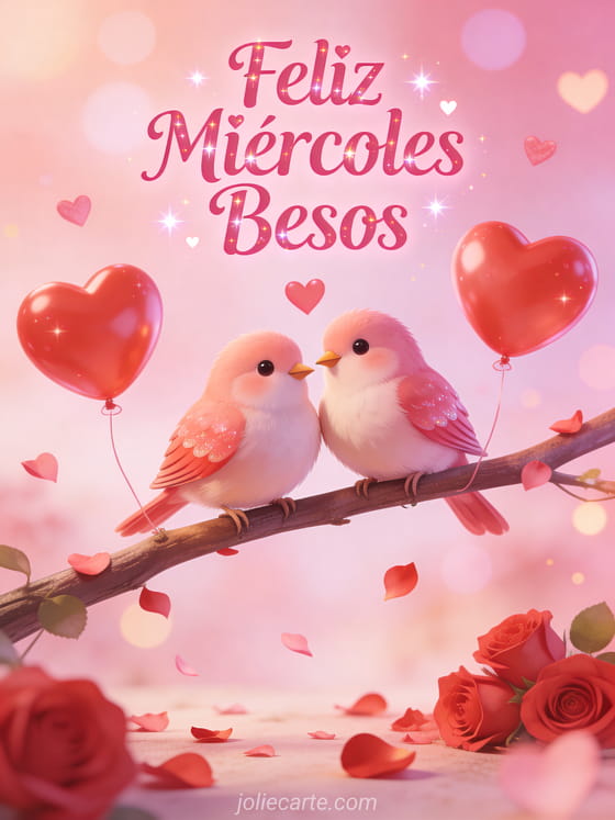 Comparte dulces besos del miércoles con esta romántica tarjeta con dos inseparables en una rama rodeados de globos en forma de corazón y pétalos de rosa. Descubre también buenos días para el miércoles o buenos días feliz miércoles zen para más inspiración.