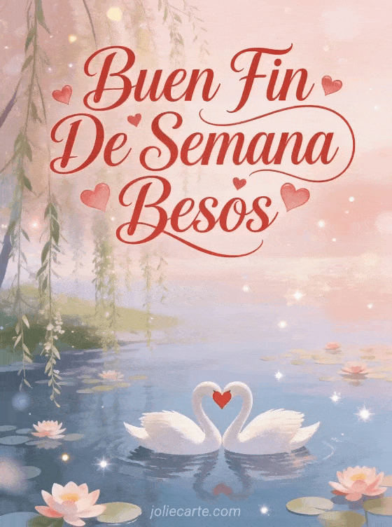 Comparte un tierno saludo animado con dos cisnes formando un corazón entre nenúfares. Descubre también una buen fin de semana imágenes o una buen fin de semana para ustedes.
