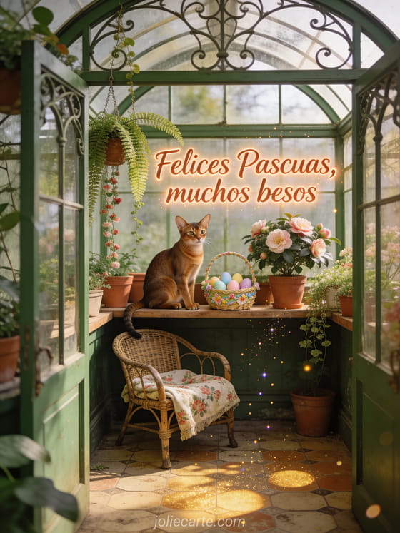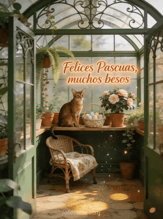 Comparte este tierno gif de besos de Pascua con un adorable gato abisinio y camelias de primavera. Descubre también gif de Pascua gratis o tarjeta felices Pascuas.