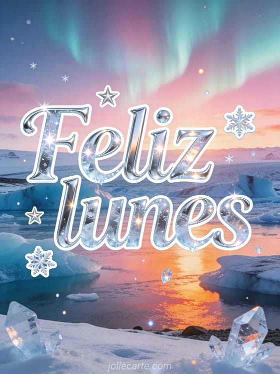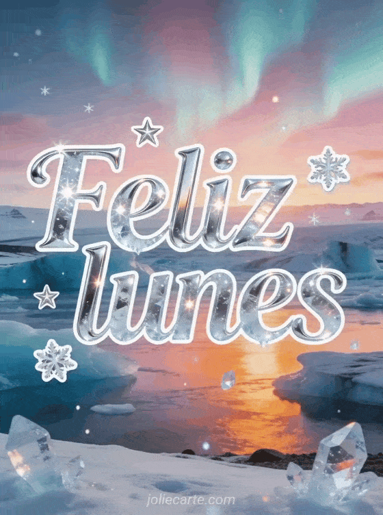 Envía un gif brillante de feliz lunes brillante con letras plateadas heladas, estrellas gélidas y los icebergs azules de Jokulsarlon bajo un atardecer rosa y naranja. Comparte un deseo invernal mágico y descubre también feliz lunes soleado gif, lunes besos imágenes o feliz lunes humor divertido.