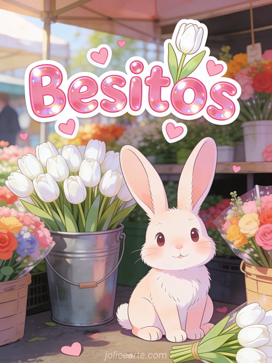 Comparte dulces besitos con esta encantadora tarjeta primaveral con un conejo en un mercado de flores. También pueden interesarle una linda tarjeta besos o gif pez besos para más saludos tiernos de besos.