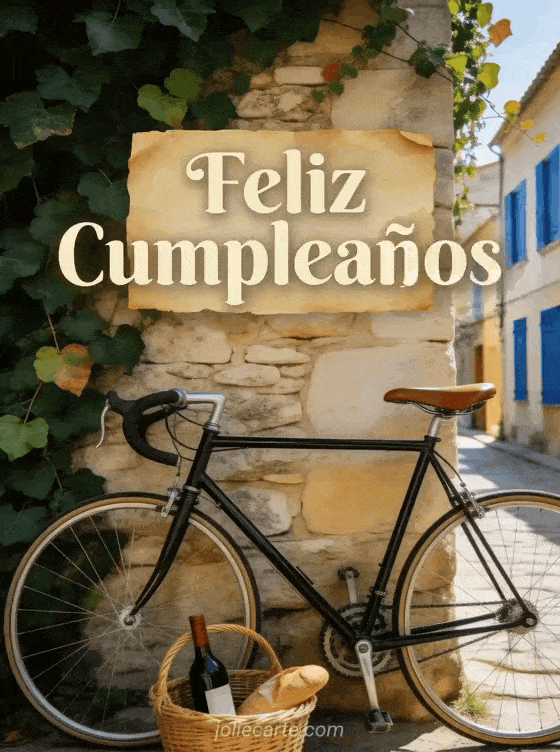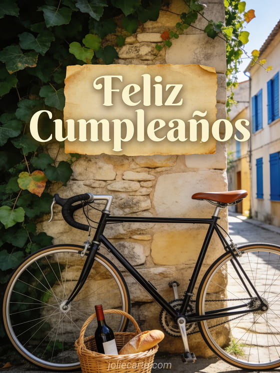 Desea un feliz cumpleaños con esta encantadora tarjeta con una bicicleta de carreras vintage contra un muro de piedra cubierto de hiedra en una calle provenzal soleada. Descubre también imágenes de feliz cumpleaños hombre, un texto de cumpleaños hombre con humor gratis o una tarjeta de cumpleaños hombre con humor.
